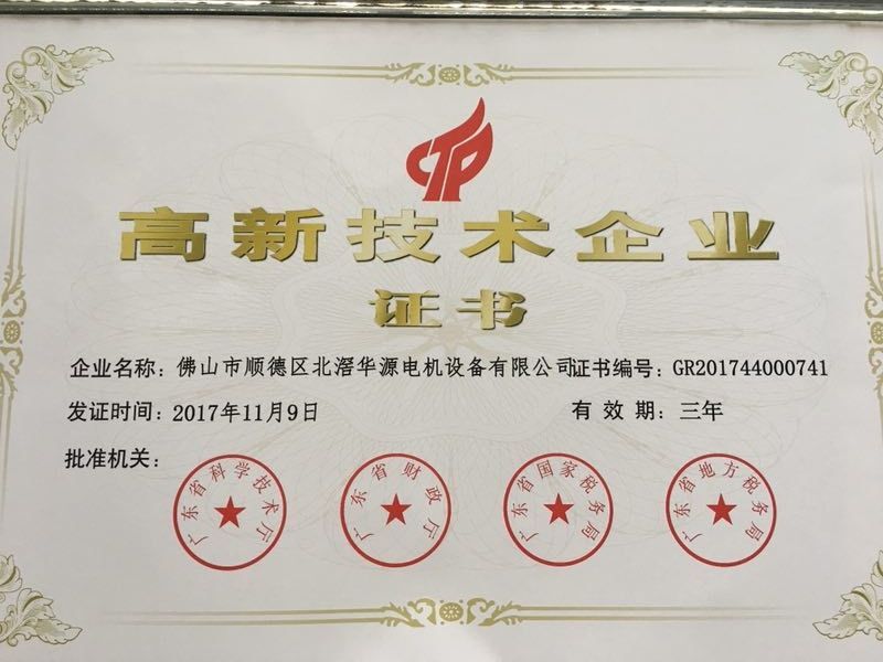 華源電機設備有限公司喜獲“高新技術企業(yè)證書”。該項認定由廣東省科學技術廳、廣東省財政廳、廣東省國家稅務局及廣東省地方稅務局頒發(fā),證書編號:GR201744000741。