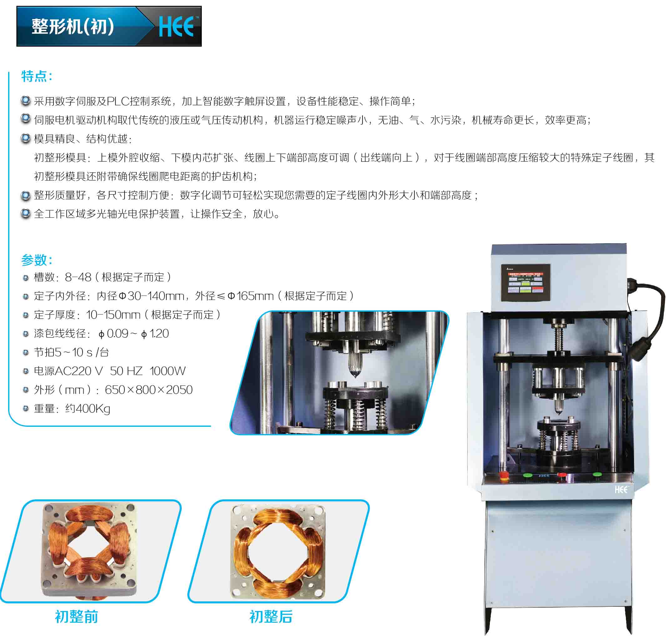 華源電機(jī)設(shè)備有限公司定子終整型機(jī)采用數(shù)字伺服及PLC控制系統(tǒng)智能控制,模具采用“上模內(nèi)芯擴(kuò)張、下模內(nèi)芯擴(kuò)張、外腔收縮”來按照工藝要求對內(nèi)外線圈的定子完美整型,使定子更加耐久,符合安全要求和美觀而設(shè)計(jì)??蓪?.10-----1.20mm嵌好的漆包線定子按工藝要求對內(nèi)外線圈進(jìn)行完美整型,輕易安裝轉(zhuǎn)子和端蓋。操作簡單,性能穩(wěn)定,效率高;其優(yōu)勢在于: