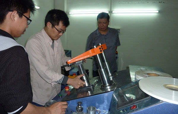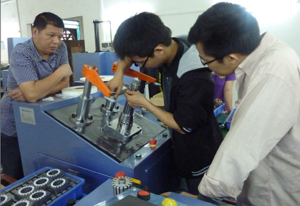 今天開始樂普達(dá)的培訓(xùn)。樂普達(dá)電機(jī)公司在二月底向本公司購買了兩組嵌線設(shè)備,包括電機(jī)嵌線機(jī)、電機(jī)綁線機(jī)、電機(jī)槽紙機(jī)、電機(jī)槽片機(jī)、電機(jī)初整形機(jī)和電機(jī)終整形機(jī)。前天已經(jīng)生產(chǎn)和調(diào)試完畢,現(xiàn)在已經(jīng)運(yùn)往樂普達(dá)電機(jī)公司其車間進(jìn)行試產(chǎn)。圖為本公司技術(shù)人員正在為客戶解說設(shè)備的操作和應(yīng)注意事項(xiàng)。